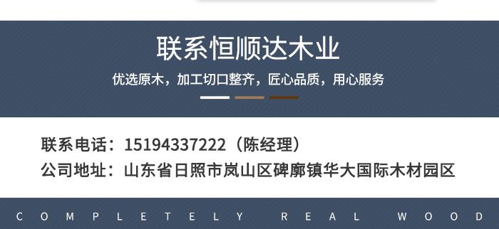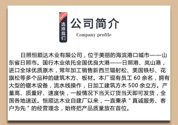 日照恒顺达木业有限公司,位于美丽的海滨港口城市——山东省日照市。国行木业依托全国优良大港——日照港、岚山港,进口全球优质原木,常年加工销售新西兰辐射松、美国铁杉、花旗松等多个品种的建筑木方、板材。本厂现有员工60余名,拥有大型的锯木设备,先进的流水线,日加工建筑方木500余立方。产量高、质量好、速度快,一般情况下当天订货当天即可发货,全国各地速送。恒顺达木业自建厂以来,一直秉承“真诚服务、信誉至上”的经营理念,始终把产品质量放在首位,赢得了广大客户的一致好评,竭诚欢迎新老客户前来洽谈、惠顾!
