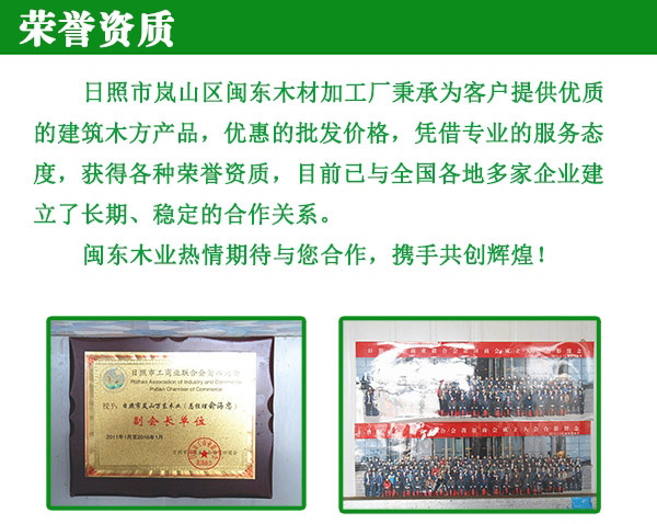 日照市岚山区闽东木材加工厂成立于2007年,位于美丽的海滨城市日照市,东临日照港,北临青岛港,南临连云港,交通便利,运输便捷。是一家从事原木销售及建筑木方加工的企业,公司主要销售新西兰辐射松、美国云杉、铁杉、花旗松、俄罗斯白松、落叶松、樟子松等木材品种,同时可根据客户需要加工各种规格的建筑工地所需的木方、板材及装修木方。公司经过三年的努力,已经拥有完善的加工设备和加工工艺,技术力量雄厚,为国内外的客户提供了大量的合格木材。