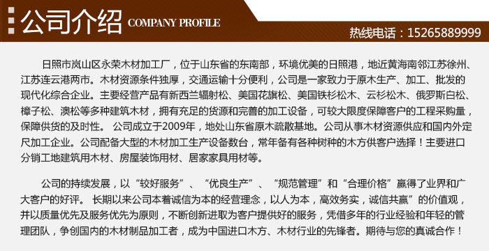 日照永荣木业有限公司,位于山东省的东南部,环境优美的日照港,地近黄海,南邻江苏徐州、江苏连云港两市。木材资源条件独厚,交通运输十分便利,公司是一家致力于原木生产、加工、批发的现代化综合企业。主要经营产品有新西兰辐射松、美国花旗松、美国铁杉松木、云杉松木、俄罗斯白松、樟子松、澳松等多种建筑木材,拥有充足的货源和完善的加工设备,可较大限度保障客户的工程采购量,保障供货的及时性。 公司成立于2009年,地处山东省原木疏散基地。公司从事木材资源供应和国内外定尺加工企业。公司配备大型的木材加工生产设备数台,常年备有各种树种的木方供客户选择!主要进口分销工地建筑用木材、房屋装饰用材、居家家具用材等。